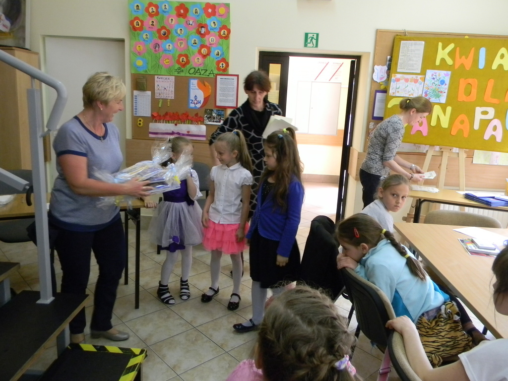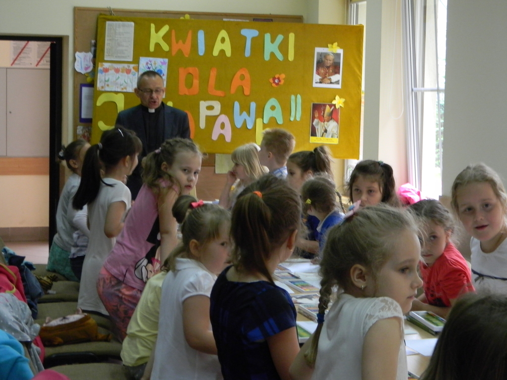 25 maja w Parafii Św. Filipa i Jakuba w Żorach odbył się powiatowy konkurs plastyczny, w którym wzięło udział 39 dzieci z klas pierwszych z dekanatów Żory, Czerwionka- Leszczyny i Pawłowice. Myślą przewodnią tego konkursu jest zapoznanie dzieci z działalnością Hospicjum im. Jana Pawła II w Żorach. Dzięki prelekcji jednej z wolontariuszek uczniowie zapoznali się z pracą na rzecz pensjoriuszy i osób chorych, pozostających w swoich domach. Dzieci rysowały pastelami kwiaty dla Jana Pawła II pod okiem komisji. Uczniowie naszej szkoły osiągnęli sukces: