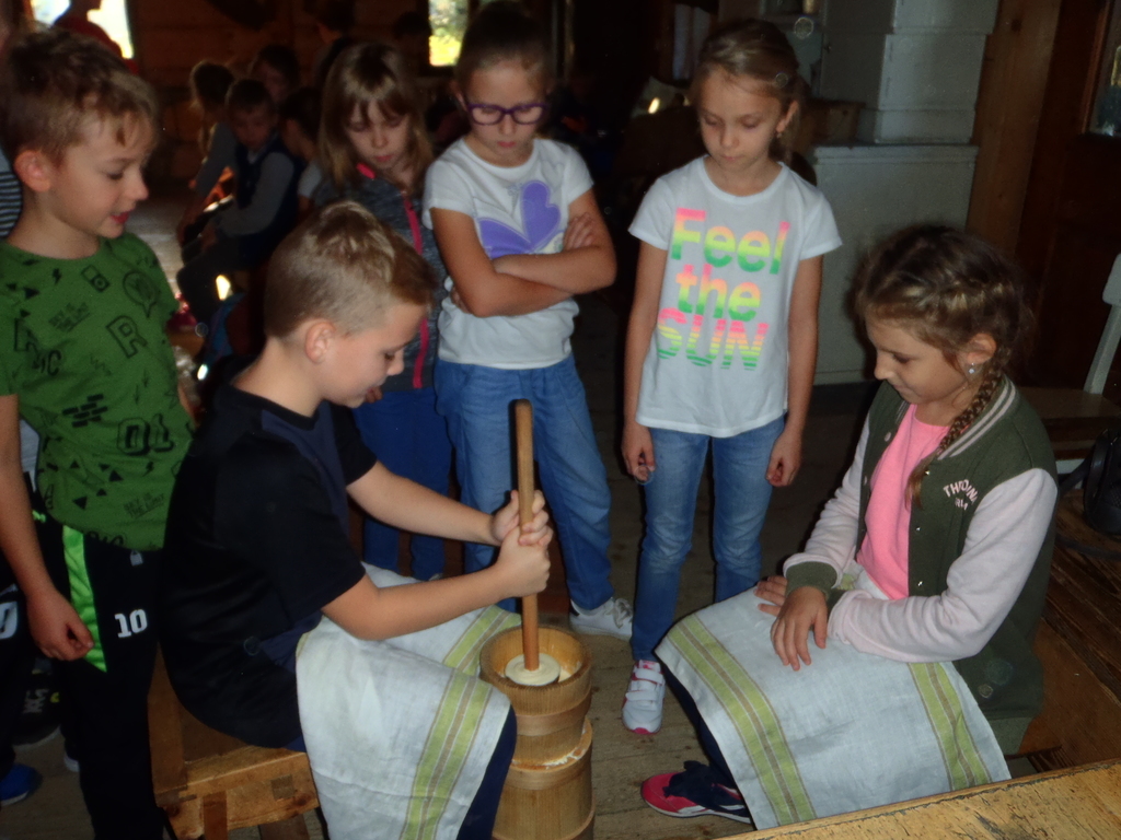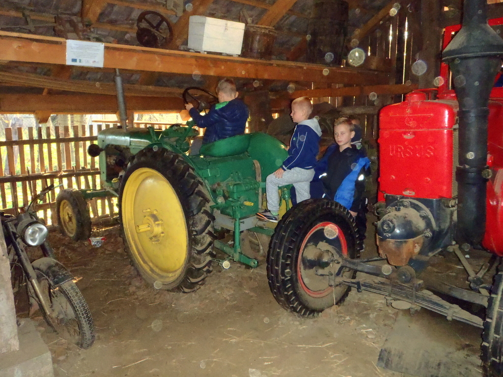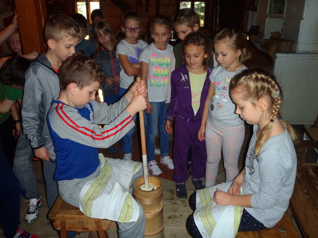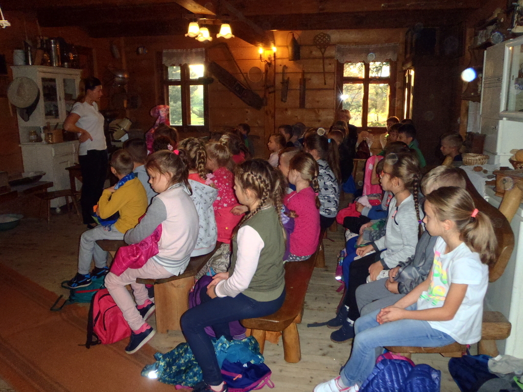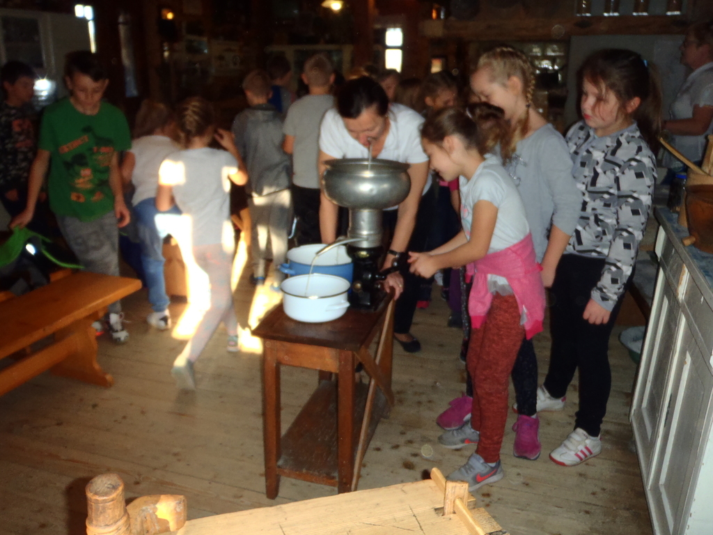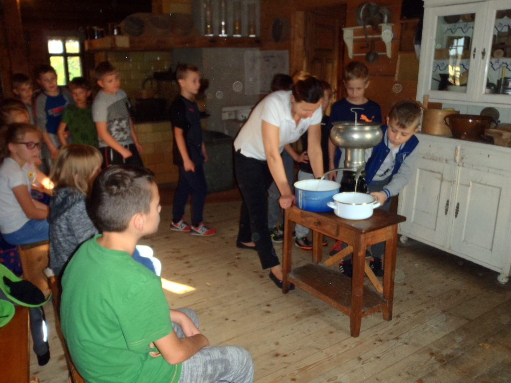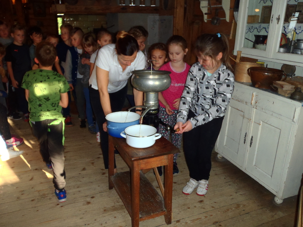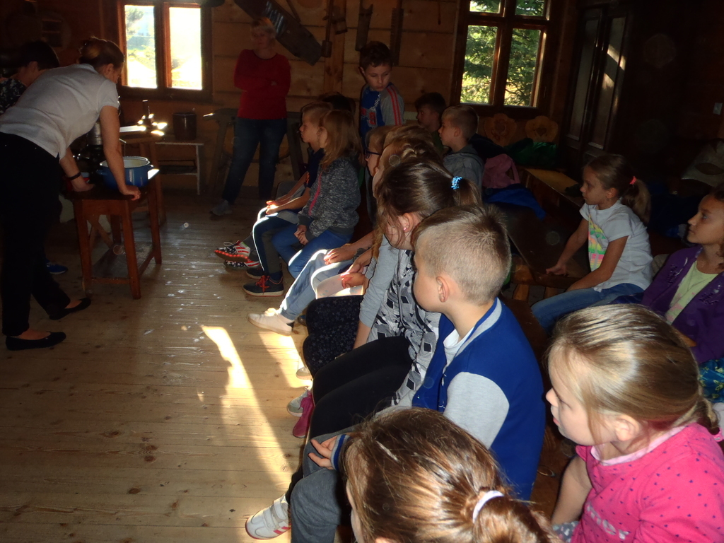 Klasy I, IIIa, IIIb pojechały na wycieczkę w magiczne miejsce. Magiczne, ponieważ, po przestąpieniu progu Chlebowej Chaty w Górkach Małych znaleźliśmy się w kuchni naszej prababci i stodole naszego pradziadka. Były tam żelazka na duszę, żarna, dzieże, karoce, stare maszyny rolnicze i wiele innych, ciekawych przedmiotów. Dzieci poznały drogę "od ziarenka do bochenka" i zajadały się zrobionymi przez siebie podpłomykami, poznały proces wyrobu masła i sera. Same to masło robiły, a potem kosztowały go z podpłomykami i chlebem. Degustacja była pełna, bo to Chata miodem i kawą zbożową słynąca. Dzieci wysłuchały również ciekawostki z życia pszczół. Obok Chaty znajduje się super miejsce na upieczenie kiełbaski, zjedzenie śniadania i na zabawy. A, że pogoda była jak marzenie, to zabawa była na całego.