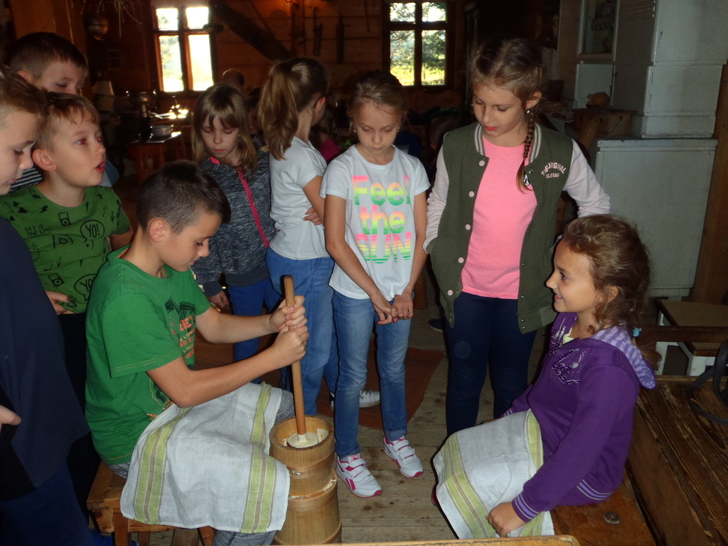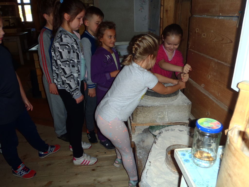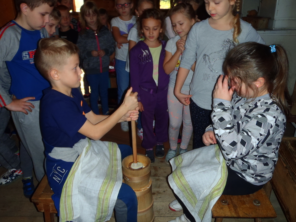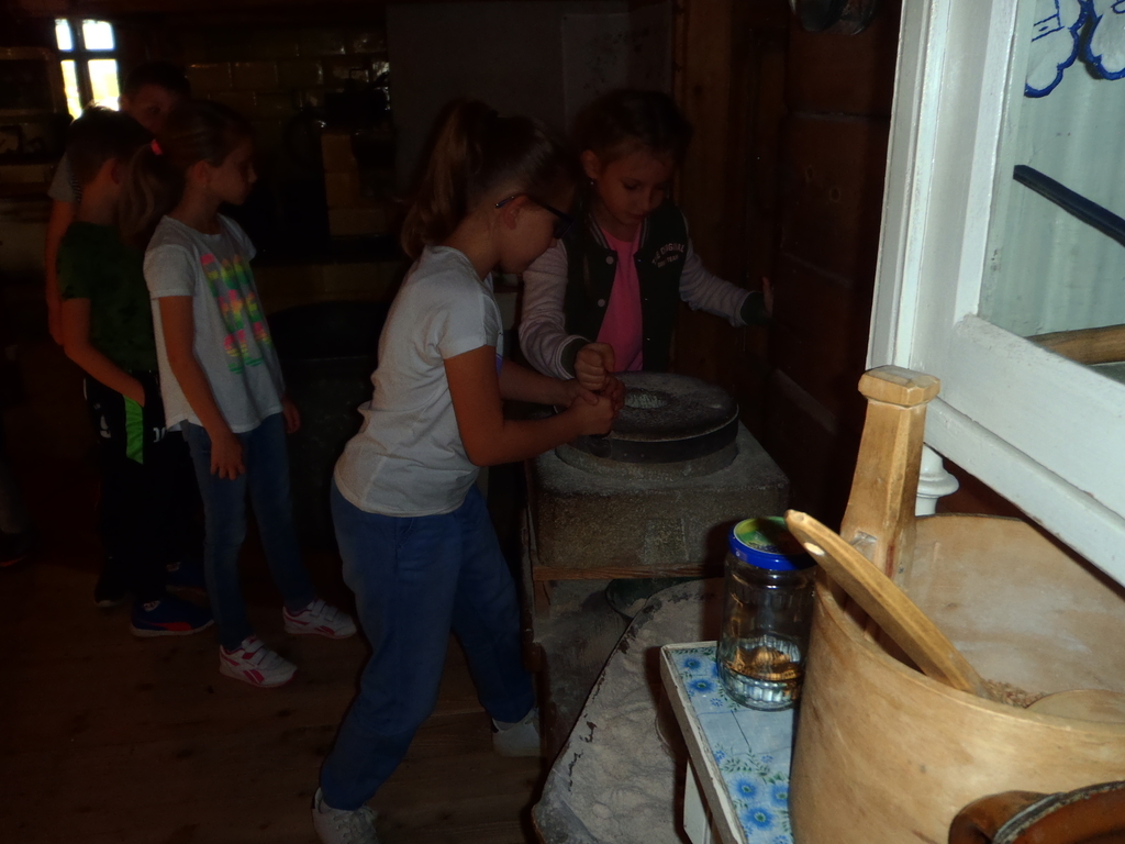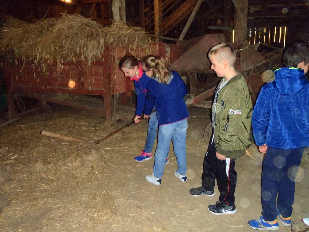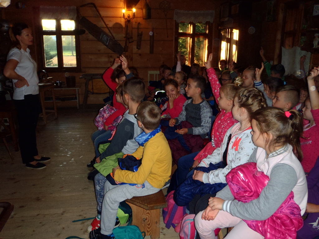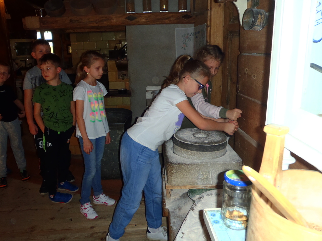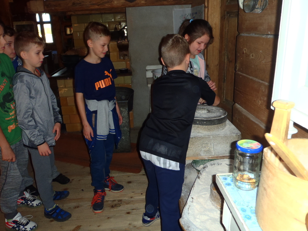 Klasy I, IIIa, IIIb pojechały na wycieczkę w magiczne miejsce. Magiczne, ponieważ, po przestąpieniu progu Chlebowej Chaty w Górkach Małych znaleźliśmy się w kuchni naszej prababci i stodole naszego pradziadka. Były tam żelazka na duszę, żarna, dzieże, karoce, stare maszyny rolnicze i wiele innych, ciekawych przedmiotów. Dzieci poznały drogę "od ziarenka do bochenka" i zajadały się zrobionymi przez siebie podpłomykami, poznały proces wyrobu masła i sera. Same to masło robiły, a potem kosztowały go z podpłomykami i chlebem. Degustacja była pełna, bo to Chata miodem i kawą zbożową słynąca. Dzieci wysłuchały również ciekawostki z życia pszczół. Obok Chaty znajduje się super miejsce na upieczenie kiełbaski, zjedzenie śniadania i na zabawy. A, że pogoda była jak marzenie, to zabawa była na całego.