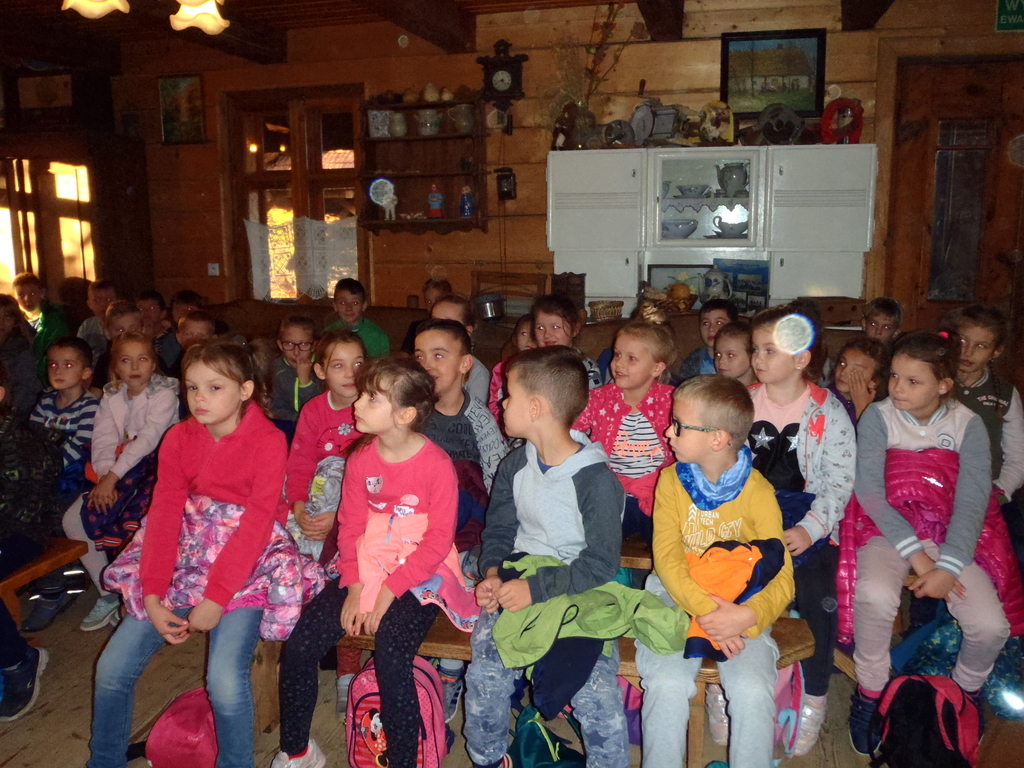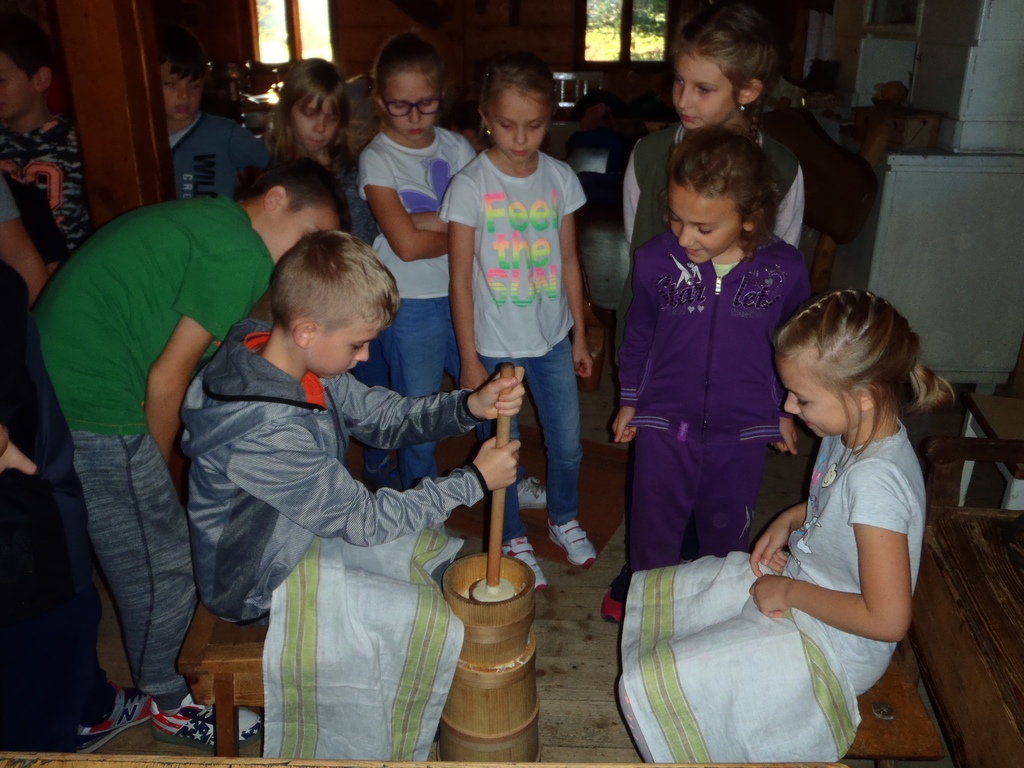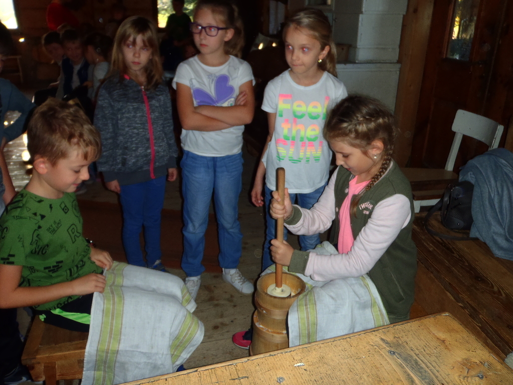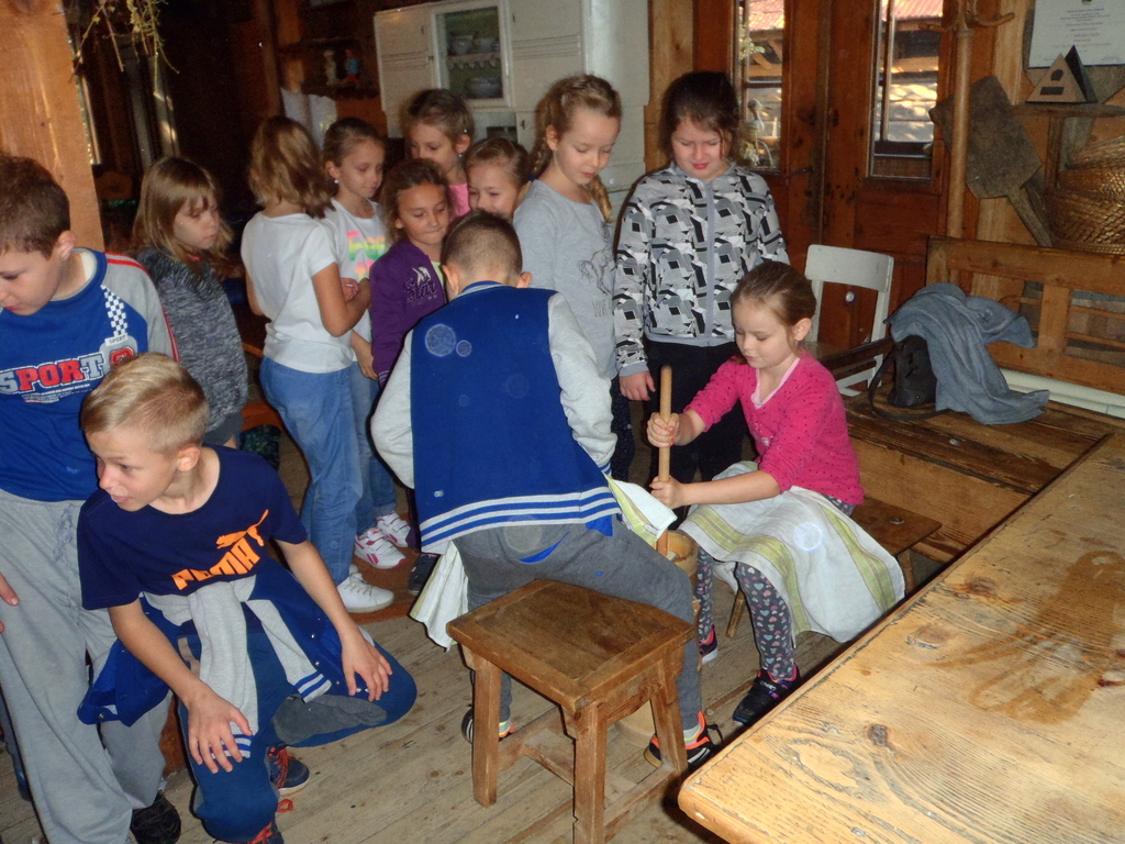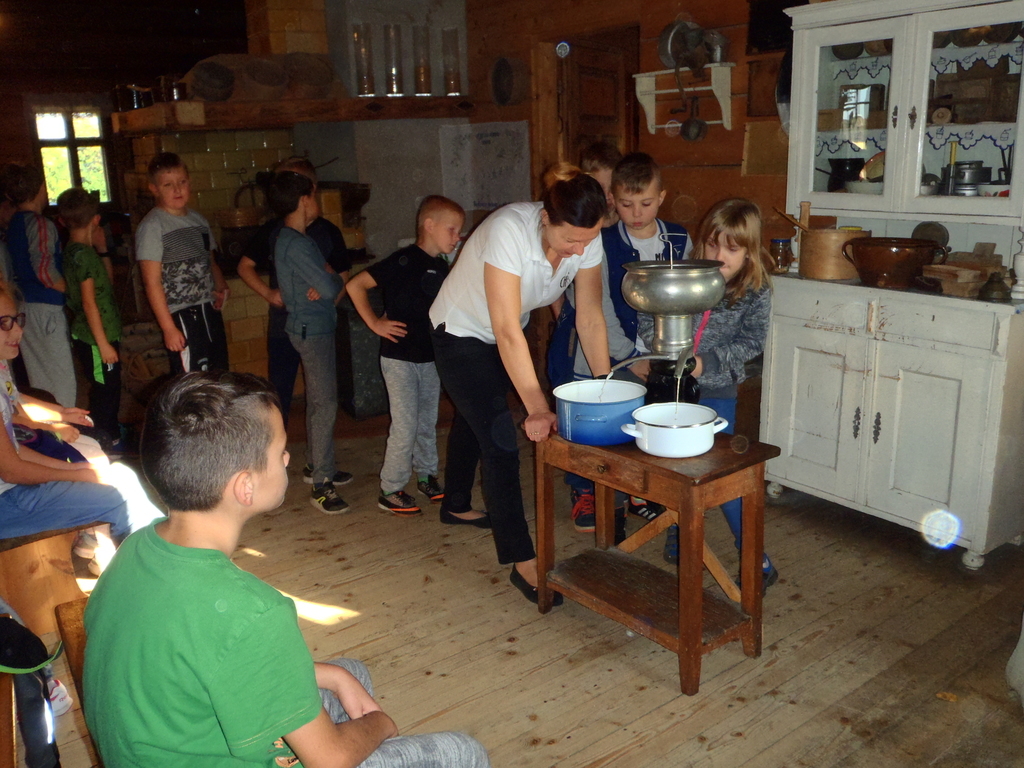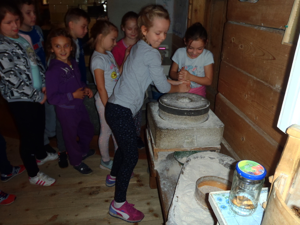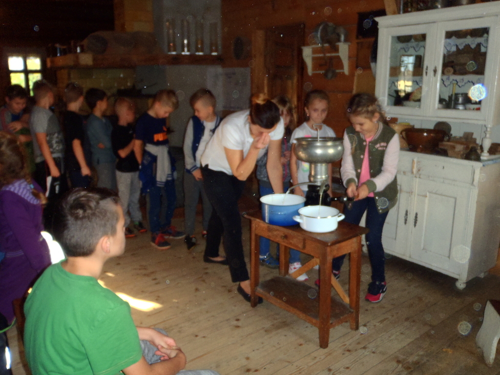 Klasy I, IIIa, IIIb pojechały na wycieczkę w magiczne miejsce. Magiczne, ponieważ, po przestąpieniu progu Chlebowej Chaty w Górkach Małych znaleźliśmy się w kuchni naszej prababci i stodole naszego pradziadka. Były tam żelazka na duszę, żarna, dzieże, karoce, stare maszyny rolnicze i wiele innych, ciekawych przedmiotów. Dzieci poznały drogę "od ziarenka do bochenka" i zajadały się zrobionymi przez siebie podpłomykami, poznały proces wyrobu masła i sera. Same to masło robiły, a potem kosztowały go z podpłomykami i chlebem. Degustacja była pełna, bo to Chata miodem i kawą zbożową słynąca. Dzieci wysłuchały również ciekawostki z życia pszczół. Obok Chaty znajduje się super miejsce na upieczenie kiełbaski, zjedzenie śniadania i na zabawy. A, że pogoda była jak marzenie, to zabawa była na całego.