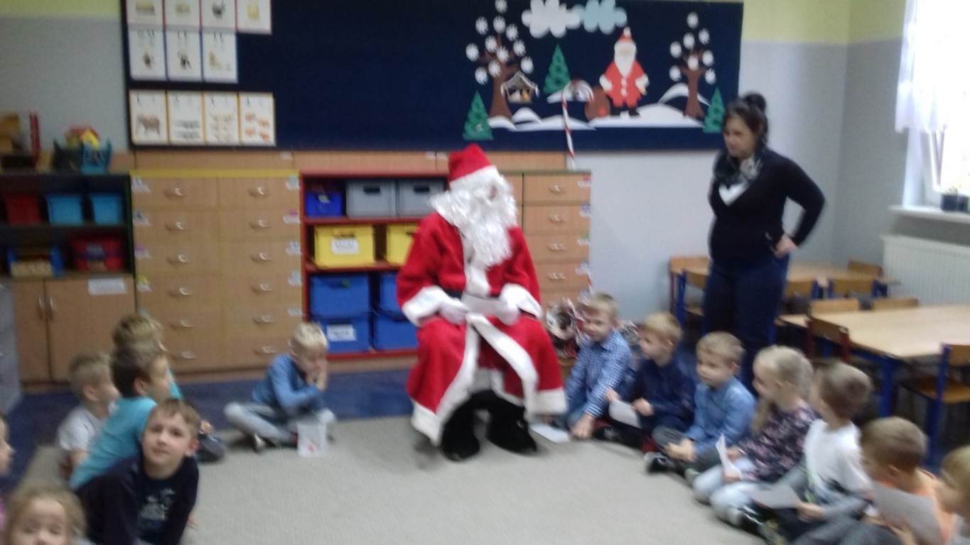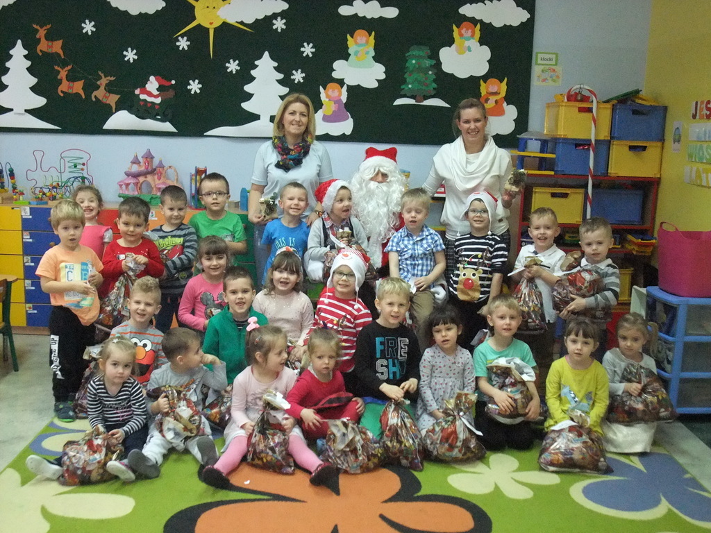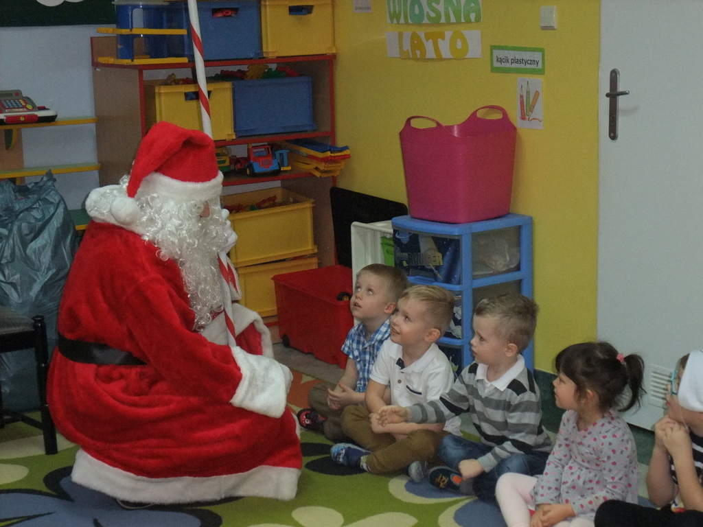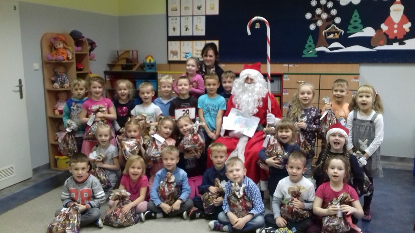 „Witaj Mikołaju miły gościu nasz, chcemy Ciebie dziś przywitać, bo już przyszedł czas” tymi słowami przedszkolaki powitały Mikołaja. Ponadto zaprezentowały swoje umiejętności artystyczne, które Mikołajowi bardzo się spodobały. Na dowód tego obdarował wszystkie dzieci upominkami. Obiecał również, że odwiedzi nas za rok.